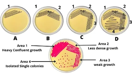 在三區基礎上增加一個區域,四個區域依次遞減、輕微搭接,稀釋效果更徹底,能進一步降低菌量密度,適合污染嚴重或菌量高的樣品,提高純培養的成功率。