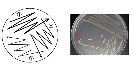將平板劃分為三個逐漸縮小的區域,接種環依次密集到稀疏劃線,并與前一區輕微搭接,通過逐級稀釋在第三區獲得單菌落,常用于臨床標本的首次分離,尤其適合菌量不高的樣品。